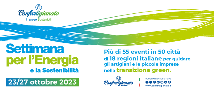 Dal 23 al 27 ottobre si svolge in tutta Italia la prima edizione della Settimana per l’Energia e la Sostenibilità organizzata da Confartigianato. Un evento diffuso in 50 città di 18 Regioni con 55 appuntamenti promossi dalle Associazioni del Sistema Confartigianato per guidare gli artigiani e le piccole imprese nella transizione green.
