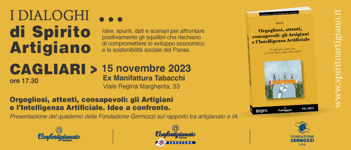Mercoledì 15 novembre, dalle ore 17:30, i suggestivi spazi dell’Ex Manifattura Tabacchi a Cagliari ospitano il quarto appuntamento con i Dialoghi di Spirito Artigiano, gli eventi organizzati dalla Fondazione Germozzi e da Confartigianato Imprese per approfondire idee, spunti e scenari per lo sviluppo economico e la sostenibilità sociale del Paese. In Sardegna, in particolare, il confronto tra i relatori seguirà il filo conduttore del rapporto tra Intelligenza Artificiale e artigianato, delle opportunità legate al fare impresa e delle conseguenze registrate negli ultimi anni in tanti, diversi settori dell’artigianato.