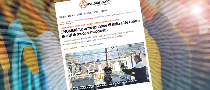 Un esame degli ultimi dati sulla produzione industriale pubblicati dall’Istat confermano la difficile congiuntura della manifattura, appesantita dalla crisi di due settori chiave del made in Italy, la moda e meccanica. L’analisi della crisi che attanaglia i due comparti è proposta nell’articolo ‘I NUMERI/ Le armi spuntate di Italia e Ue contro la crisi di moda e meccanica’ a firma di Enrico Quintavalle, responsabile dell’Ufficio Studi di Confartigianato, pubblicato oggi su il Sussidiario.net.