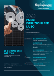 Tratteremo del Piano Nazionale di Ripresa e Resilienza, tematica di grande attualità, con relatori istituzionali quali Elisabetta Gualmini, Deputato del Parlamento Europeo, Irene Priolo, Assessore all’ambiente, difesa del suolo e della costa, protezione civile Regione Emilia Romagna, Anna Lisa Boni Assessore Fondi europei, cabina di regia PNRR, relazioni internazionali Città metropolitana di Bologna e, con loro, approfondiremo gli scenari presenti e futuri in merito all’economia del nostro paese e le opportunità in esso previste per le piccole e medie imprese