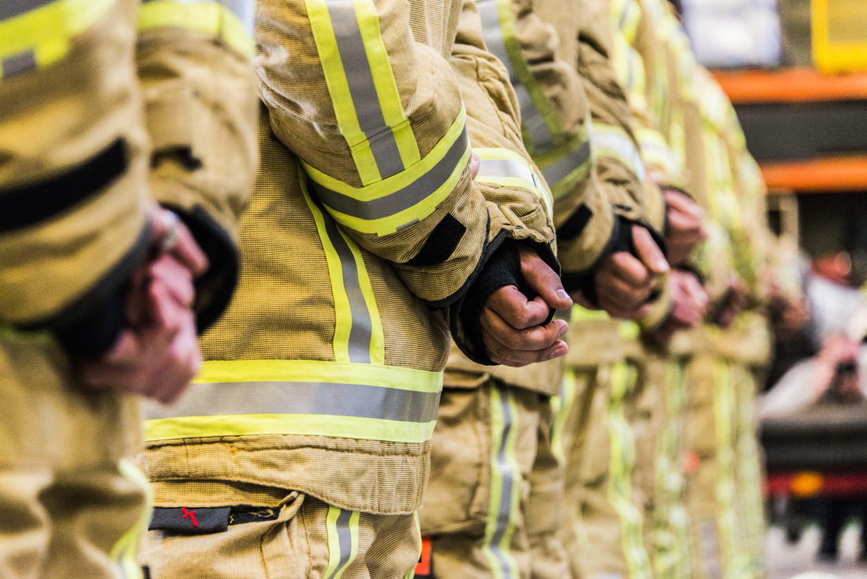 Firefighter equipement fire resistant trousers and helmet emergency services