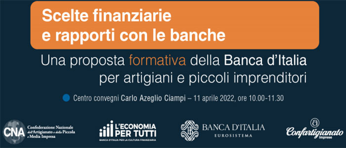 Scelte finanziarie e rapporti con le banche: è il tema del progetto di educazione finanziaria dedicato agli artigiani e i piccoli imprenditori, promosso da Banca d’Italia in collaborazione con Confartigianato e Cna, che verrà presentato lunedì 11 aprile, con inizio alle ore 10, nel corso di un evento che potrà essere seguito in diretta streaming a questo link: