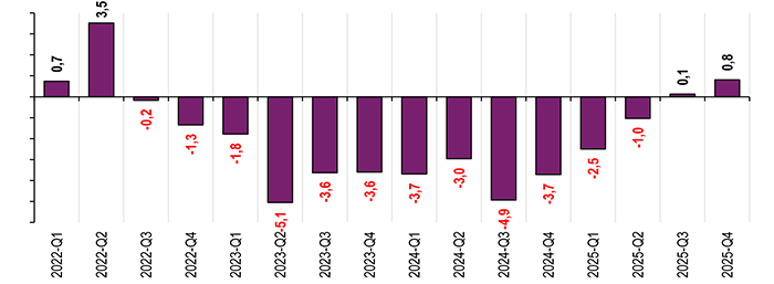 Perdura la crisi dell’auto – Persiste un calo a doppia cifra (-10,3%) per la produzione di autoveicoli, ma si dimezza l’intensità rispetto al crollo del 22,6% registrato nel 2024. Un segnale positivo arriva dalla stabilizzazione della produzione automobilistica (-0,1% su base annua) nell’ultimo trimestre del 2025.