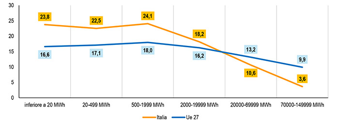 Peso oneri e accise sul prezzo dell’elettricità in Italia e UEa 27 per classe di consumo