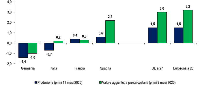 Var. % tendenziale, produzione primi 11 mesi 2025 produz. dati corretti per gg lavorativi, val. agg. primi 9 mesi 2025 prezzi costanti, destag. e corretti per gg lavorativi – Elaborazione Ufficio Studi Confartigianato su dati Eurostat