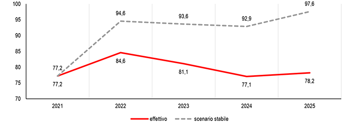 Nonostante i diffusi impulsi recessivi che hanno frenato la crescita, tra il 2021 e il 2026 l’Italia cumula una crescita del PIL del 7,8%, facendo meglio della Francia (+7,2% nel quinquennio) e della Germania (+1,8% nel quinquennio).