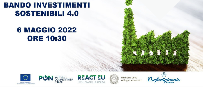 Il 6 maggio 2022, il Ministero dello Sviluppo economico, Invitalia e Confartigianato hanno organizzato il webinar “PON IC-REACT EU BANDO INVESTIMENTI SOSTENIBILI 4.0” sulle nuove opportunità a disposizione delle imprese italiane. Nel corso dell’evento è stato presentato il nuovo Bando Investimenti Sostenibili 4.0, che offre sostegno agli investimenti innovativi e sostenibili per la trasformazione tecnologica e digitale dell’impresa. Con una dote complessiva di quasi 678 milioni di euro e il 25% dei fondi riservato ai progetti delle micro e piccole imprese, il bando punta a sviluppare innovazione e sostenibilità verso il paradigma dell’economia circolare.