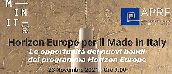 Le opportunità dei nuovi bandi del programma Horizon Europe per le filiere del made in Italy e le possibilità di finanziamento per le aziende manifatturiere italiane saranno approfondite ad un evento on line e gratuito organizzato il 23 novembre dal Cluster MinIt e da APRE – Agenzia per la Promozione della Ricerca Europea.